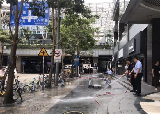 目击市民林先生介绍,当天中午2点多,途径南山区文心六路海岸大厦东座路段,看到路面湿漉漉的一片,一名穿着保安服的男子和两名疑似物业工作人员的男子正在冲洗路面。